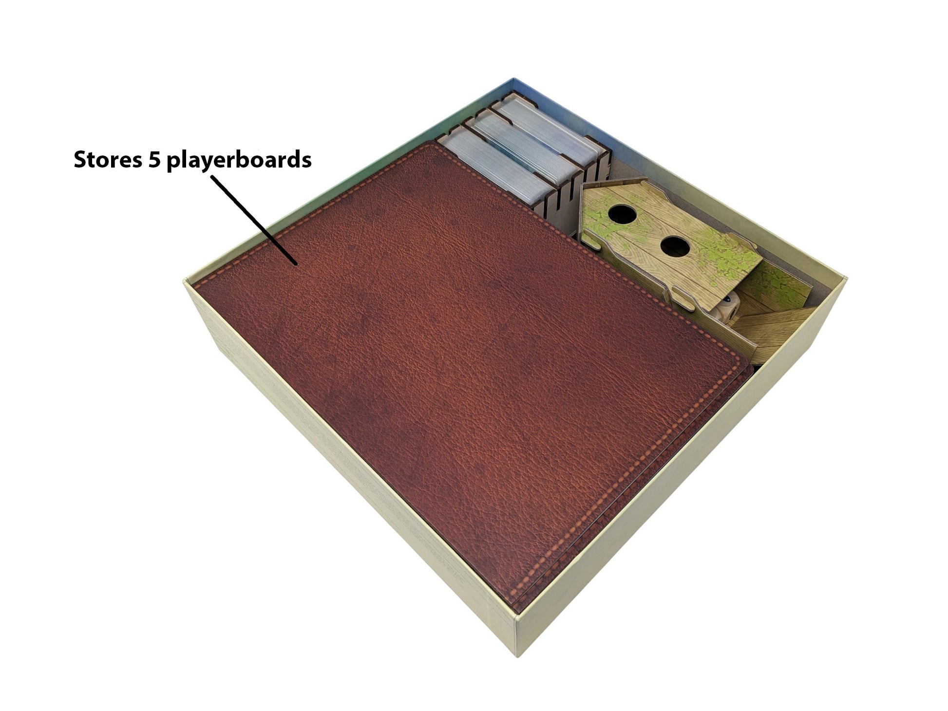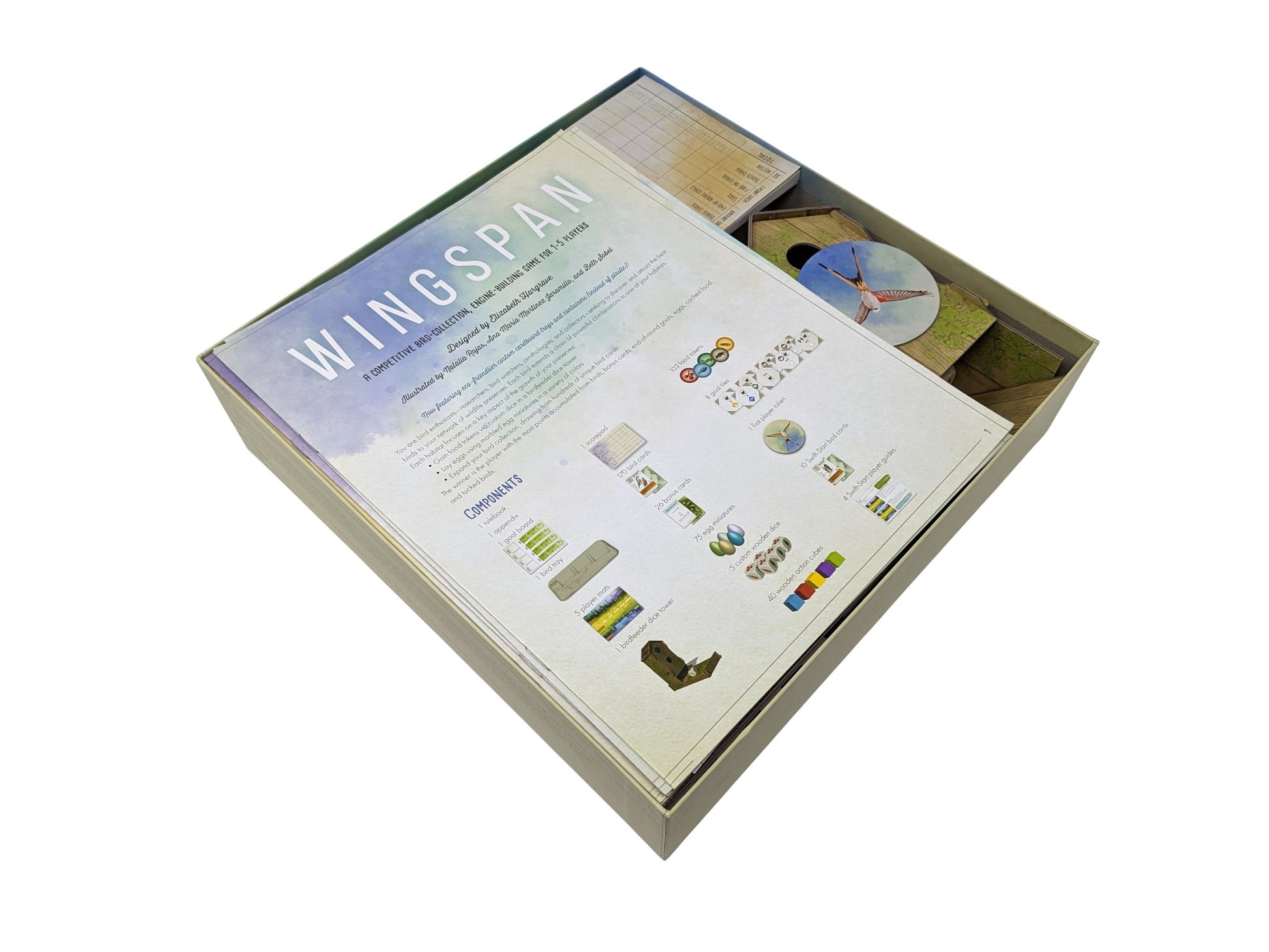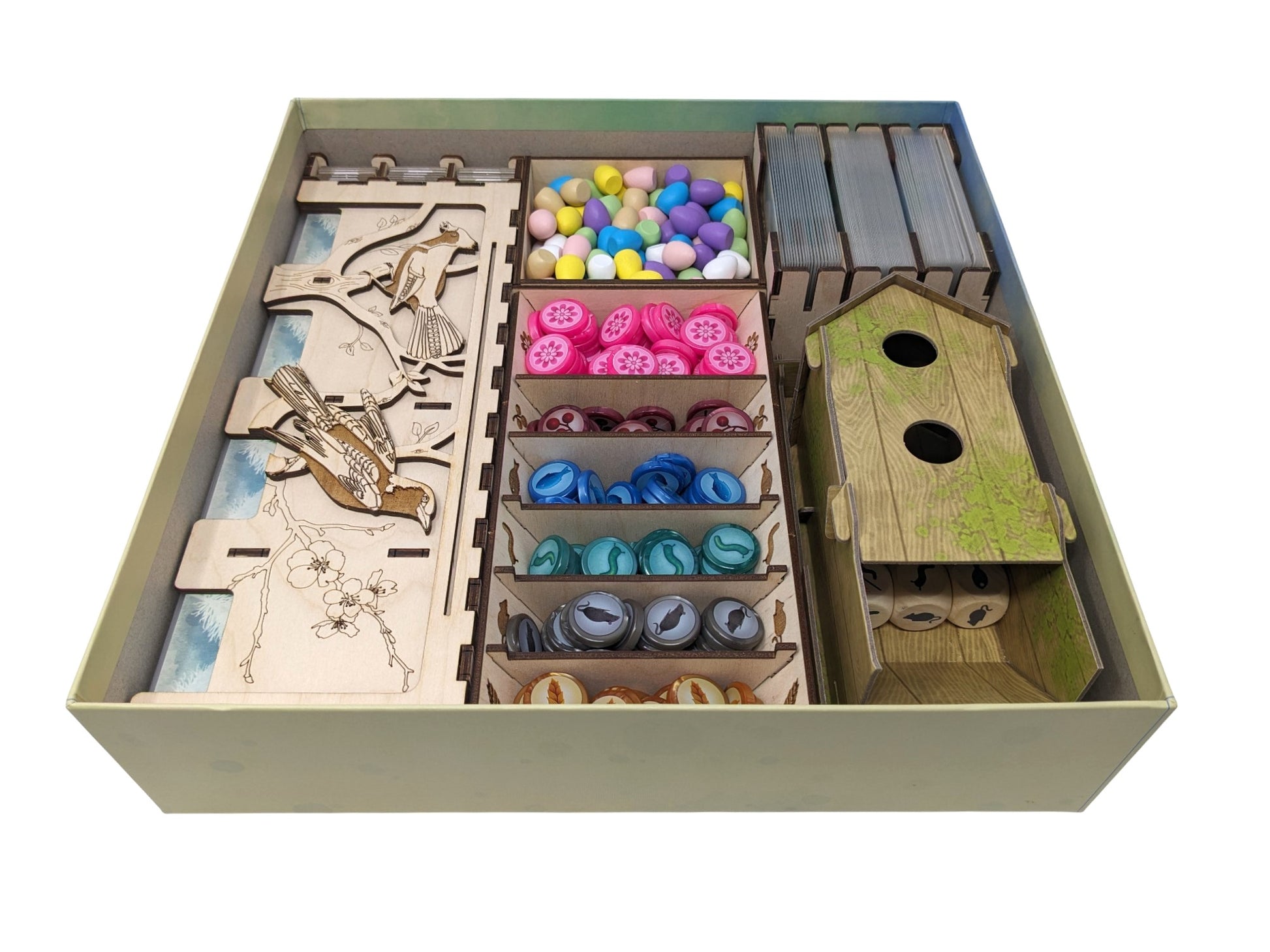 Bird lovers, this one is for you! Our organizer for Wingspan is finally here. We've taken our time with this beloved game to ensure the best play experience as well as provide artwork that you can enjoy for years to come. The primary card storage box doubles as a display for bird cards and food tokens are stored separately for use during game-play. The secondary card storage organizes Bonus cards, Automa cards, and provides additional space for Bird cards.
